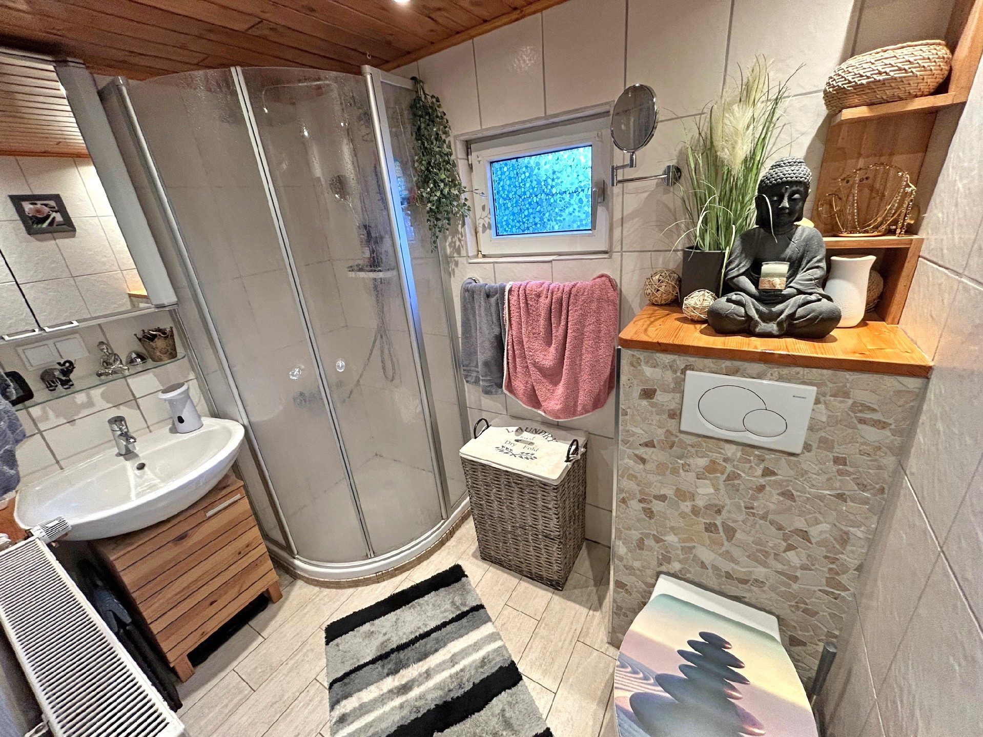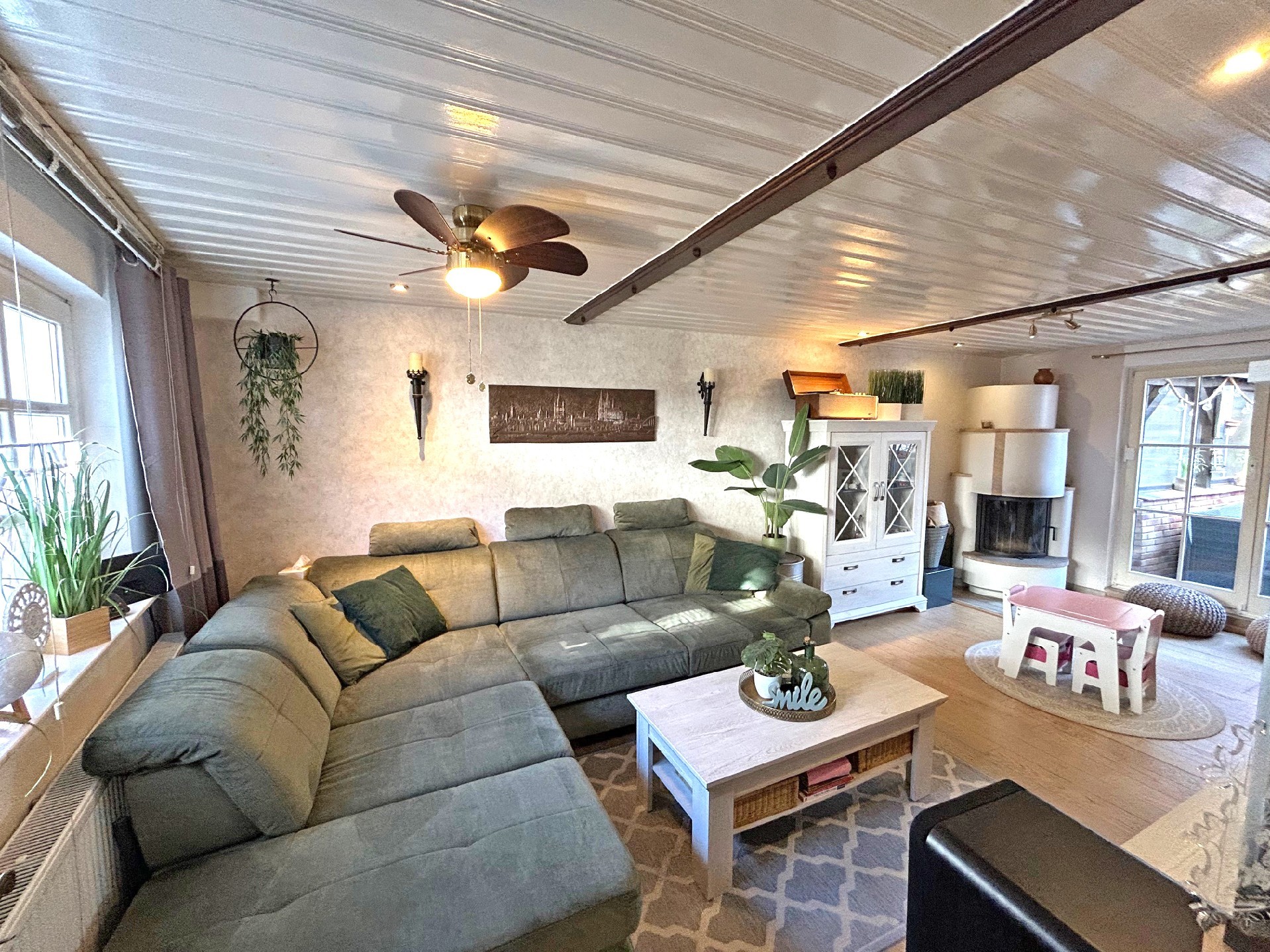 Im Erdgeschoss erwarten Sie eine Wohnküche mit einer neuen Einbauküche aus 2023, ein helles Wohnzimmer mit Kamin sowie der Zugang zum ca. 40 m² großen, teils überdachten Innenhof. Ob entspannte Sommerabende, kleine Topfgärten oder gemütliche Stunden ohne aufwendige Gartenarbeit, dieser Außenbereich bietet den Komfort eines Rückzugsortes ohne den Pflegeaufwand eines großen Gartens. Das moderne Duschbad rundet das Erdgeschoss ab.