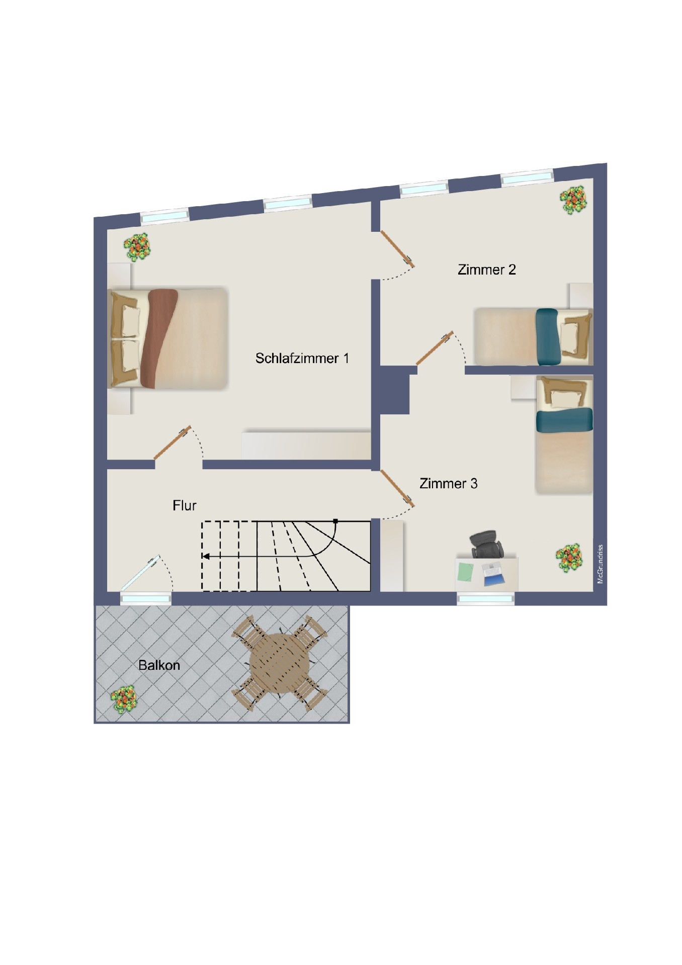 Im Obergeschoss stehen drei Zimmer zur Verfügung, darunter ein Durchgangszimmer, das sich gut als Arbeitszimmer nutzen lässt. Der überdachte Balkon bietet einen schönen Blick auf den Katharinenturm. Zusätzlichen Stauraum bietet der Dachboden, der zudem erweiterungsfähig ist und somit zukünftige Gestaltungsmöglichkeiten eröffnet. Ein Keller ist ebenfalls vorhanden und beherbergt die Heizung, die Öltanks sowie praktische Staufläche.
