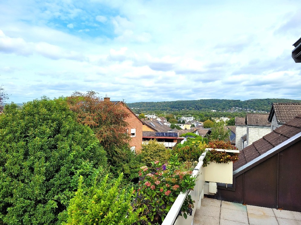 Die Wohnung überzeugt mit einer durchdachten Raumaufteilung: Herzstück ist der lichtdurchflutete Wohn- und Essbereich mit Zugang zum großen Balkon, von dem aus sich ein weiter Blick eröffnet bei klarer Sicht sogar bis zum Michaelsberg in Siegburg. Ergänzt wird die Etage durch eine halboffene Küche, ein Gäste-WC, drei weitere Zimmer sowie ein modernes Badezimmer.